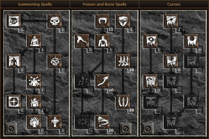 The Bone/Summoner Hybrid will divert some of the points that the Pure Bonemancer uses for synergy boosting to the Summoning Spells tree in order to pick up Revives, which provide relatively minor damage, but, more importantly, make very useful damage sponges to tank for the Necromancer.