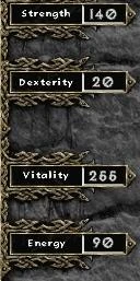 As mentioned before, this build is essentially an equivalent of the Sorceress. As such, it will focus less on the physical aspects of the primary attributes and focus mainly on the resources (Life and Mana). However, unlike the sorceress's wands and staves, items that usually boost the Elementalist's skills the most require decent amount of Strength (e.g. Earthshaker). It is therefore a good idea to keep your strength a little higher than you would expect with a caster build. Since this is a PvM build which you would ideally be taking all the way through Normal, Nightmare, and Hell, I'll be presuming that your target character level will be around 84. At that point, your stats should look as shown on the image.