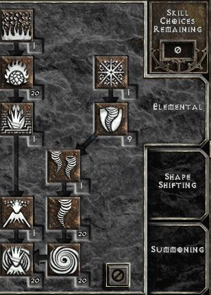 The Tornado/Boulder/Hurricane/Armaggedon skills are the most important spells you will be using; therefore, it is essential you get them to the highest level. The pace at which you do that is yours to decide, however, preferrably, your Molten Boulder should be built up constantly during Normal, since this skill will be getting you through most of the difficulty. When you are not picking up new skills, just put points into the Boulder. From level 24, you should start pumping your points into Tornado, as it can be spammed constantly (unlike Boulder). You should pick both Hurricane and Armageddon at level 30 (you must save up an extra skill point of course) and then allocate the rest of the skill points you will obtain during Normal into those two skills equally (Normal usually ends somewhere around lvl 38 so that's 5 points to each of the skills). That should ensure that they will be viable at the start of Nightmare. Once you reach Nightmare, it is best to build up Hurricane and Armageddon a little bit more first (Molten Boulder should be close to if not already level 20 so you need not worry about it anymore) and then devote a couple more points (ca 4-5) to Tornado. Tornado will be a very imporant skill for you because Hurricane, Armageddon and Molten Boulder all have a cooldown during which you can't cast either of those. Tornado does not suffer from this cooldown, therefore while your skills are recharging, you should be tossing Tornadoes around endlessly.