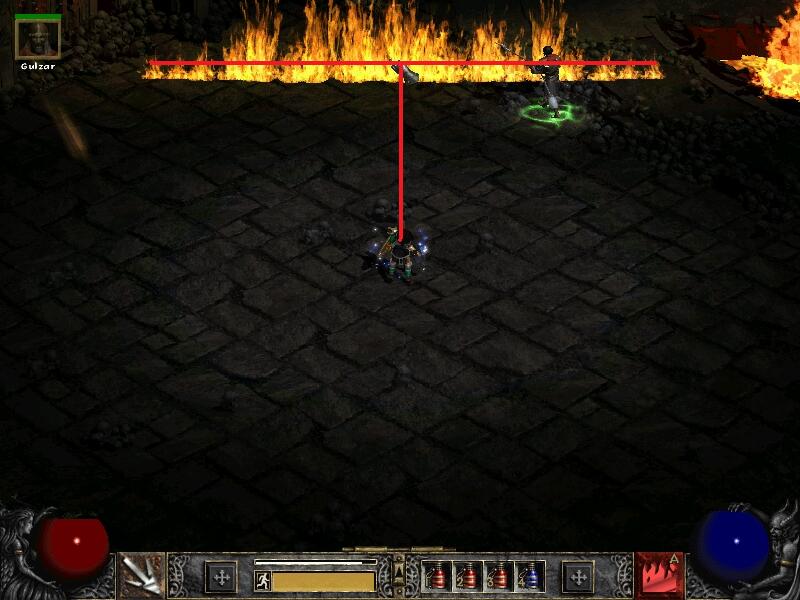 The Fire Wall Sorceress, as the name implies, is a Sorceress build whose primary attack is Fire Wall. This build can be very fun to play and, with the proper gear, can become devastatingly powerful. One thing to keep in mind is that the listed damage is per second, while the Fire Wall lasts for 3.6 seconds, so the spell actually does significantly more damage than the tooltip indicates. The trade-off for this power, however, is a somewhat counter-intuitive targeting system that can have a steep learning curve. Fire Wall is not like most skills in Diablo II, where the preferred targeting method involves clicking on a monster. While this can be effective with Fire Wall in some situations, to get the most out of the spell, you will have to learn how to make the best use of the way the Fire Wall "grows." When a player casts Fire Wall, the wall expands from the cursor at a right angle to the character. That is, if you draw a straight line between the Sorceress and the cursor, the Fire Wall will intersect the line at a 90-degree angle (see the image at the bottom of the Skills section of this guide). This can be both beneficial and frustrating. It allows the Sorceress to destroy enemies around corners or in other places where the monster can't reach her. However, it can also be difficult to get a monster into the wall, as it has a relatively thin area of effect. Often times, growing the wall in the correct direction requires you to click far away from where the target monster actually is on the screen, which can sometimes lead to Fire Walls that miss the target altogether. This may be frustrating for some players, though it may be a welcome challenge and a change from the usual for others. This can be a surprisingly effective build for leveling, though players without the proper gear may run into some challenges in late Nightmare and Hell with immunities.