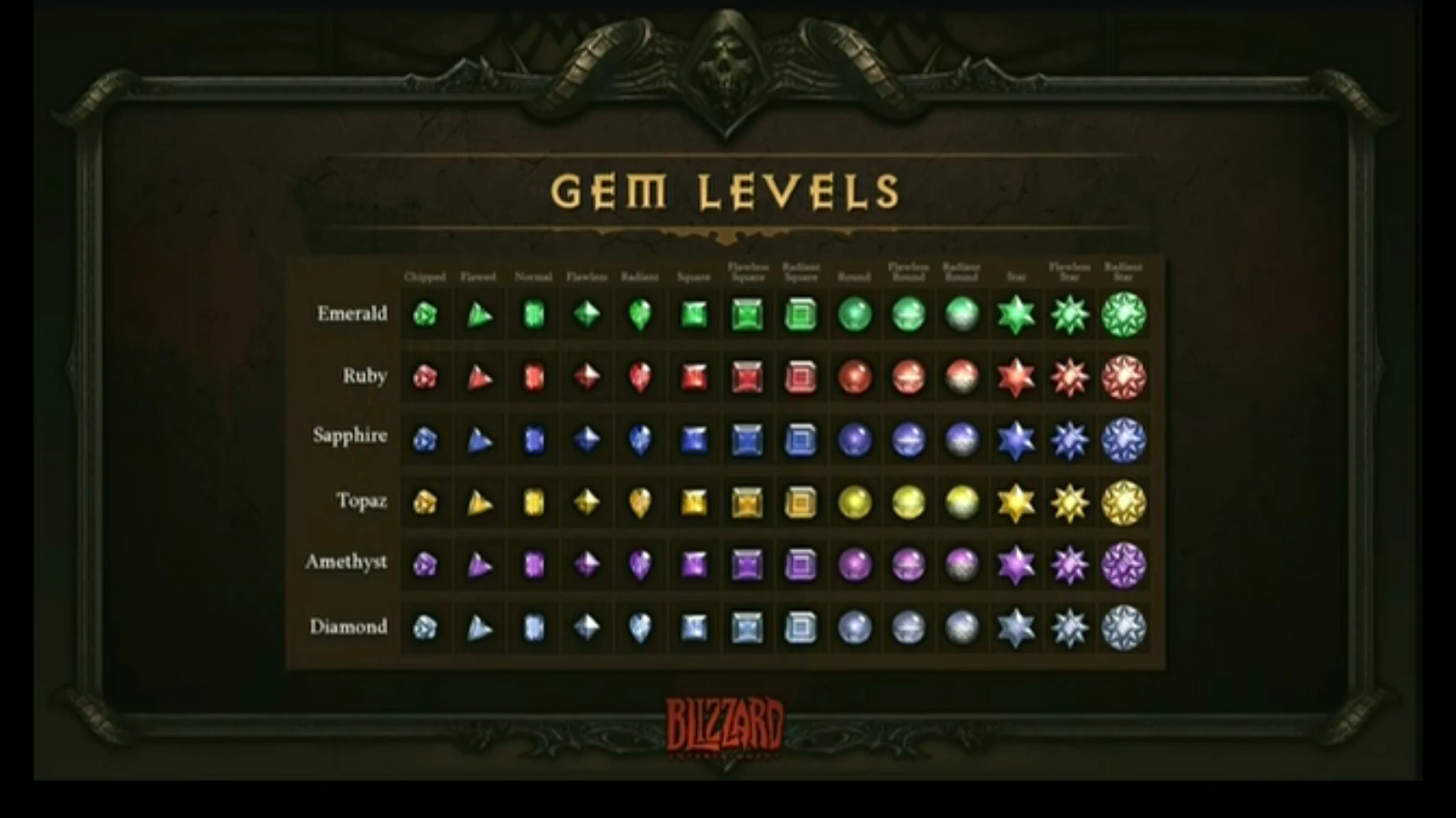 There are 14 different quality levels of gems, ranging from Chipped, the lowest quality gem, to Radiant Star, the highest quality. The higher the quality of the gem, the greater the bonus bestowed on the item. All gems, regardless of quality, have no level requirements. This means that new characters can be given significant starting bonuses if a player is wealthy and can buy powerful gems for them at creation.