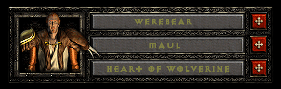 This build is primarily based on the Druid skill Werebear and the skill Maul. The Werebear skill changes the spellcasting Druid into a melee character with decent damage and a large life pool, while Maul raises the decent damage to much higher levels. Most Druids would walk around with a life giving Oak Sage, but not the Mauler. The Mauler is all about damage, so he uses the combat enhancing Heart of Wolverine.