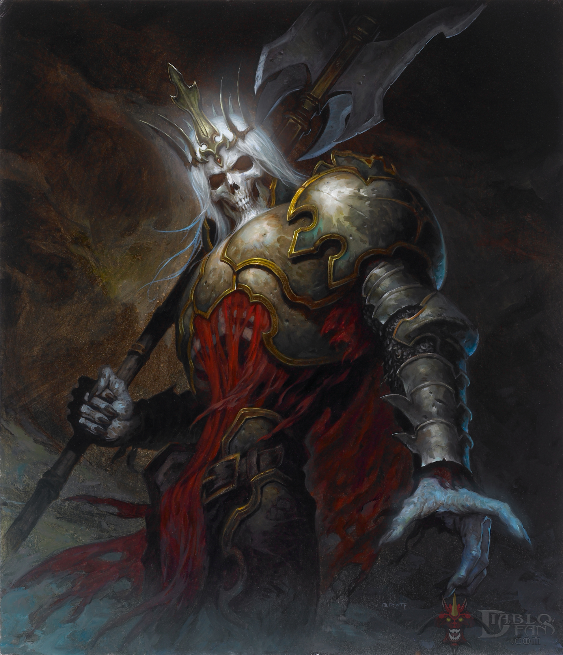 “The Zakarum High Priests in Kurast proclaimed Leoric King of Khanduras many years ago. He ruled well until Diablo's influence drove him mad and the loyal knight Lachdanan was forced to slay him. Afterward, Diablo himself raised Leoric from the dead as the Skeleton King until the monarch's son, Aidan, vanquished him.