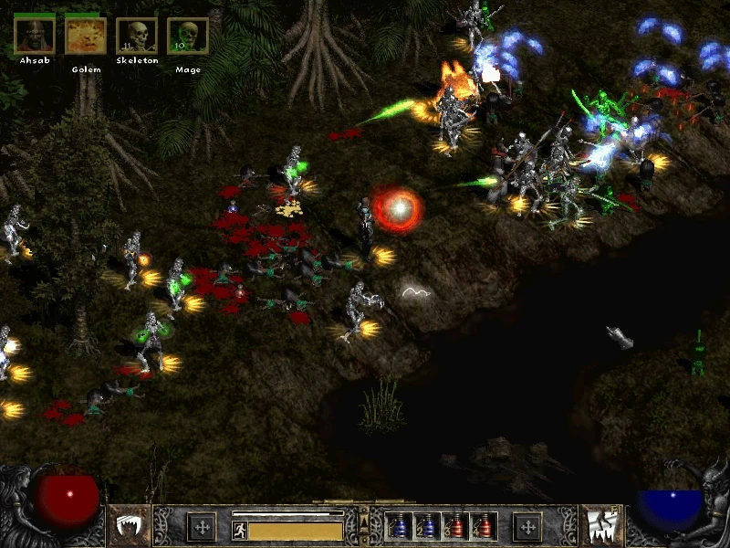 Once you have maxed out your army, Decrepify and Corpse Explosion will be the name of the game. With your Hireling now safely killing off monsters by the dozens, corpses will be an expendable resource that you can blast your enemies with at will. Thanks to Decrepify's amazing ability of making even the most powerful and threatening monster fight like a wimp with one use of the spell, your Skeleton Warriors will hardly ever die so you need not worry about leaving some corpses for resummoning your army. A vulnerable spot of your army will be the Mages; however they usually stay safely in the back and attack from afar, no need to worry there. The only other vulnerable spot of your army is then of course yourself. With no offensive skills to speak of and oftentimes a wacky combination of fun items that you chose to equip, your character is left mostly defenseless. It is therefore vital that when progressing through a dangerous area, one does not rush into the middle of a room and get instantly killed. Progress gradually and always wait for your army to catch up, or you will be leaving yourself wide open for an easy kill. Also note that even with your army around you, there are enemies that will be dangerous to you at all times, as these are mostly enemies with piercing or AoE attacks. However, the list is quite short and goes as follows: Willowisp, Slinger in Nightmare/Hell Act 5, Cold Enchanted Uniques, Lightning Enchanted Uniques, Scarab Demon, Claw Viper in Nightmare/Hell Act V. Avoid the projectiles of these monsters at all costs as they can spell quick doom for your character, should your resistances/health be too low.