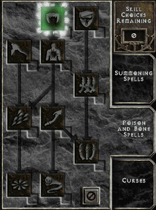 Teeth sends out a wave of small projectiles in a conical shape in front of the caster. At higher levels, its wide radius of effect can be useful for clearing out large swaths of monsters. However, unlike similar spells such as the Sorceress ' Charged Bolt skill, only one projectile can damage a monster per cast, which significantly reduces its damage potential. Points spent in Teeth are typically intended to boost the damage of the other bone spells, Bone Spear and Bone Spirit , through their synergies. Teeth itself is not frequently used as an offensive tool for the Bonemancer .